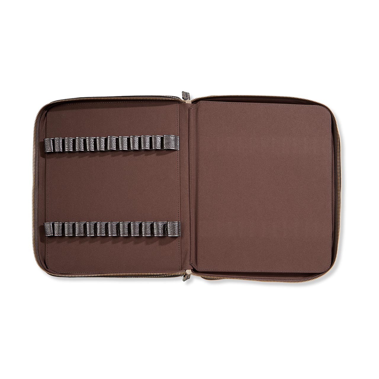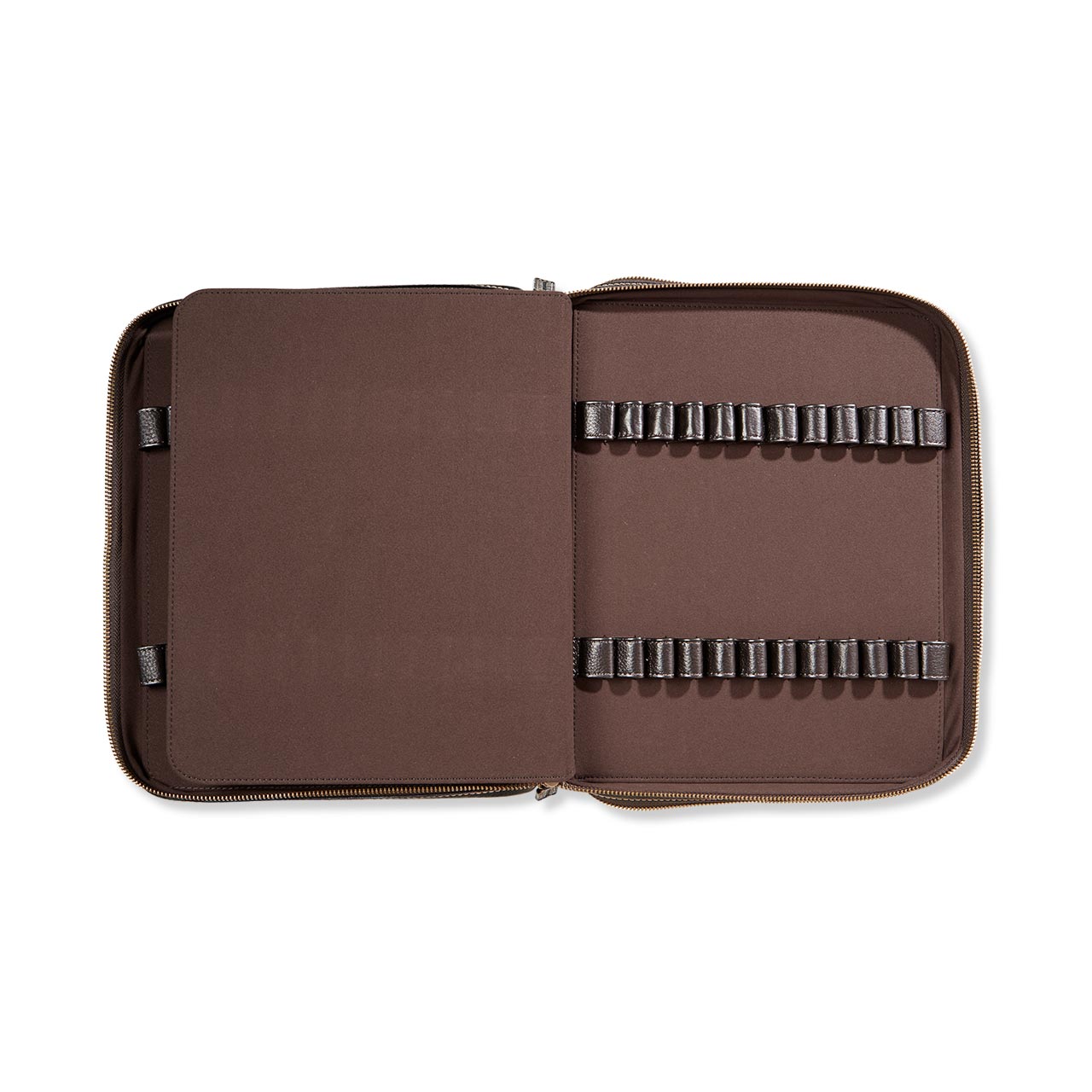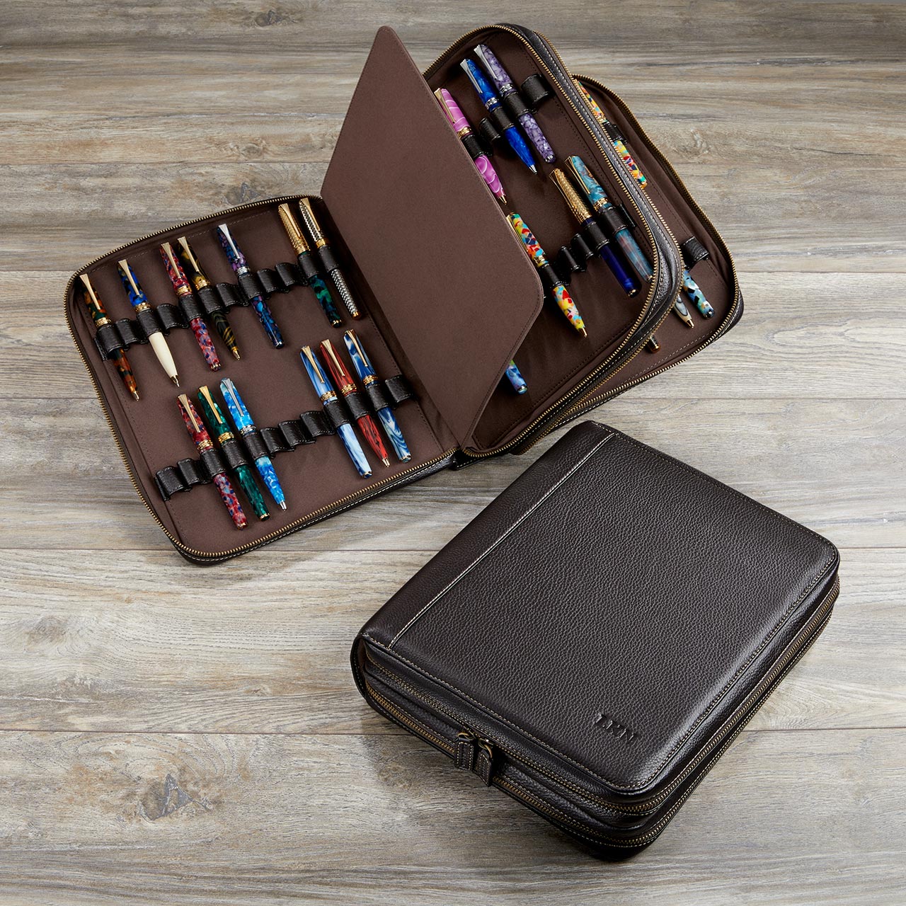 If the pen is mightier than the sword, then 96 are surely an indomitable battalion. Here’s a mightily impressive pen collector’s portfolio in our premium full-grain Bomber Jacket leather. This handsomely crafted, zip-secure leather pen case holds up to 96 of your favorite writing instruments, each in its own separate leather loop. (® Classic or Create pens fit perfectly, of course.) Inside, soft microsuede pampers your pens to keep them pristine and scratch-free. Add a personal touch with an optional monogram. The smaller pen case is also available.