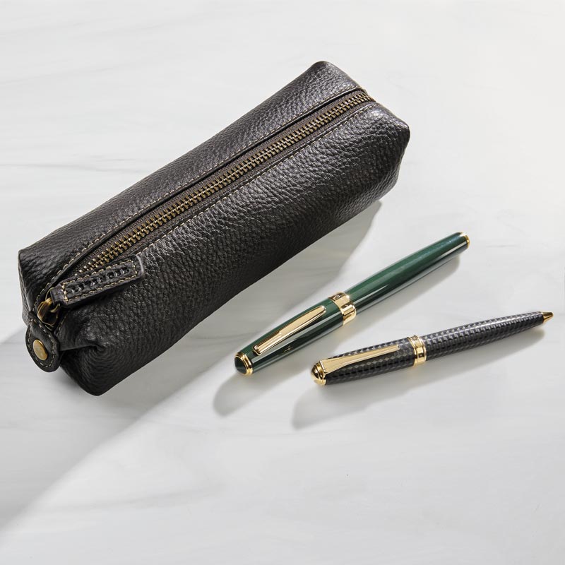 Bomber Jacket leather pouch for pens and small writing tools. Give your pens extensive coverage with our pen pouch, crafted in durable pebbled mocha Bomber Jacket leather. It can hold several of your favorite writing instruments, with space for ink refills, erasers and other small items. Slip into a brief, bag or folio and keep pens handy and ready to go.
