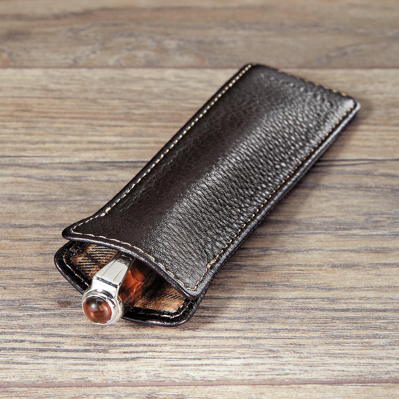 Instead of hunting for your favorite pen at the bottom of your bag, use this elegantly slim and flat leather pen holder, crafted to last in our premium full-grain Bomber Jacket leather. This leather pen sleeve lined in khaki twill protects your precious pen from nicks and scratches when you’re out and about, and makes it easy to find.