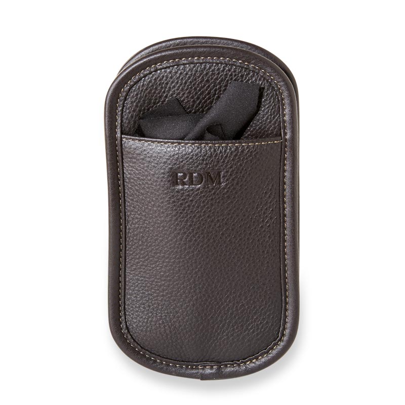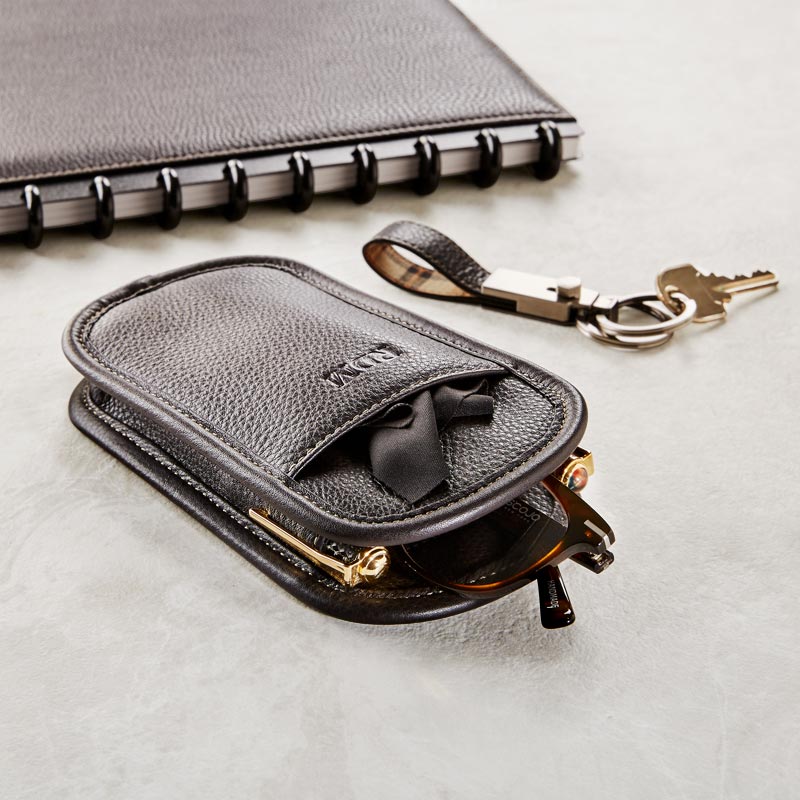 For hardly any extra space, enjoy carrying two pens riding comfortably with your glasses. In fact, the pens act as protective pillars keeping the whole ensemble united in strength. All three are protected by our smooth twill lining, internal case padding, and the natural pebbled texture of the full-grain Levenger Bomber Jacket leather exterior. The outside slip pocket can secure your cleaning cloth (included) and a few bills or cards as well as an Apple AirTag™. Available in .