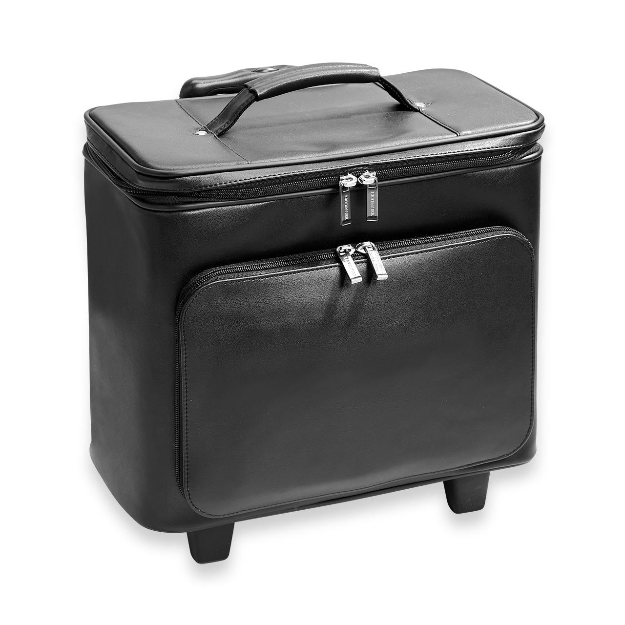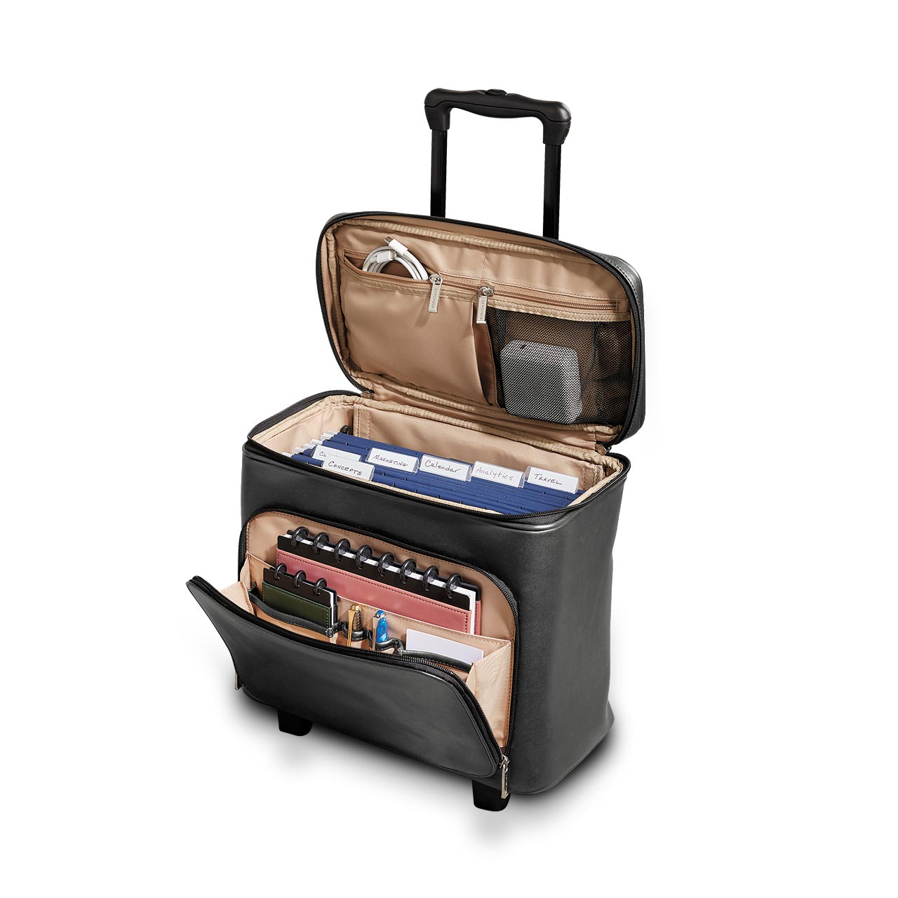 Get your act together and take it on the road with our zip-secure Portable File Tote on wheels, built for longevity in our premium LevTex™ leather alternative. Inside this compact mini rollaboard is room for your laptop and files, plus a wealth of storage and pocketing (see details below). The telescoping handle extends and retracts with the push of a button and the dual-wheel system ensures smooth and seamless perambulation.