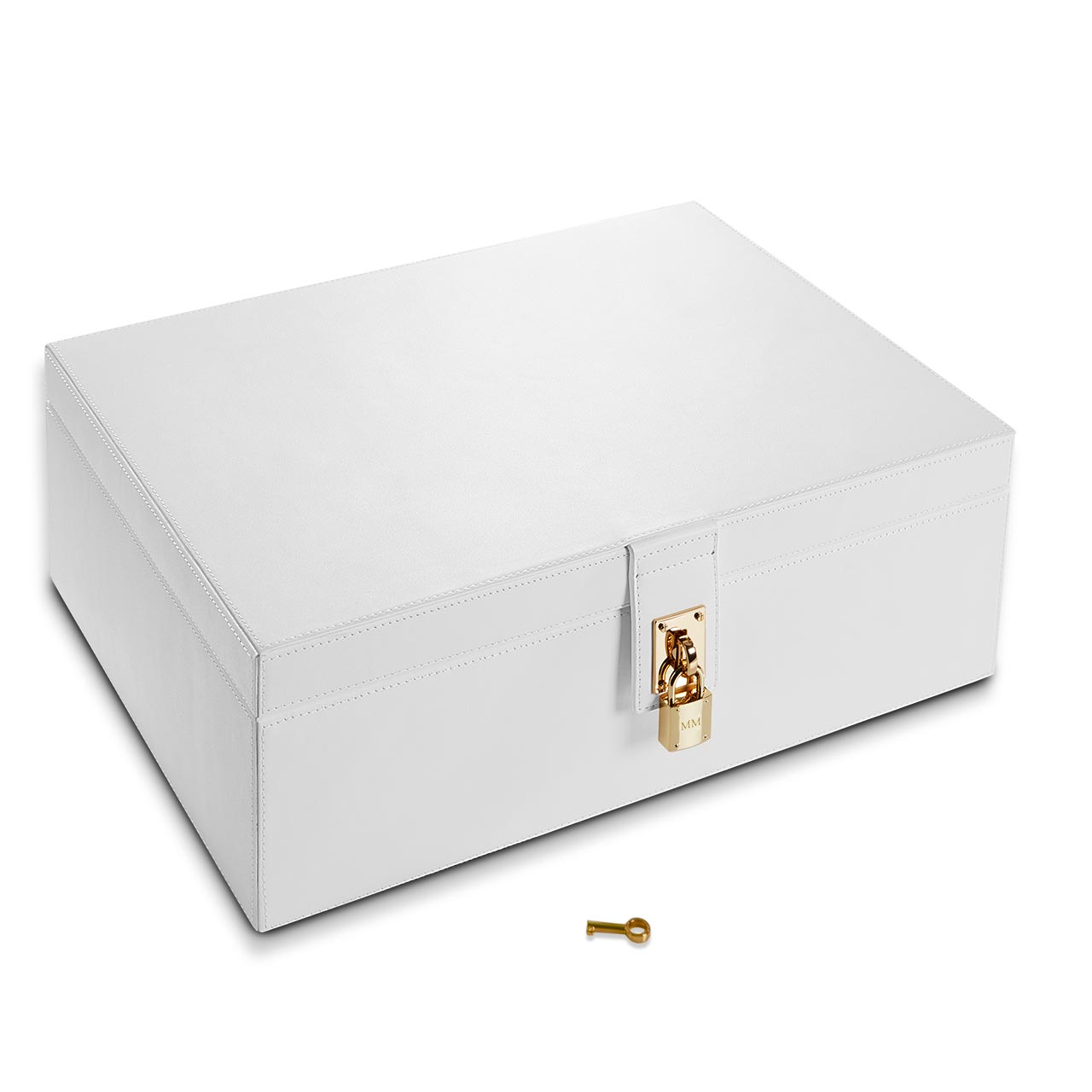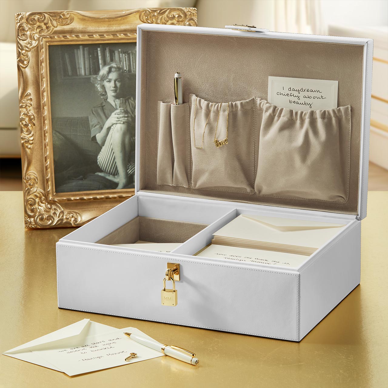 A stationery and keepsake box inspired by Marilyn Monroe. Once upon a time, a California girl named Norma Jean Baker had a dream. Her intelligence, talent and drive led her to overcome humble beginnings and transform herself into the glamorous international superstar known as Marilyn Monroe (1926–1962). Here we proudly pay tribute to the legendary star with a unique piece to inspire the dreamer in all of us. Store jewelry, keepsakes, writing instruments or stationery inside this beautifully crafted full-grain leather box, lined in soft suede. Within is a deep chamber to house items for safekeeping as well as a removable sliding top drawer. Interior pockets can hold stamps, seals, envelopes and writing implements. We include a sampler of fine stationery. Personalize the lock with an optional monogram. Discover more of our exclusive .