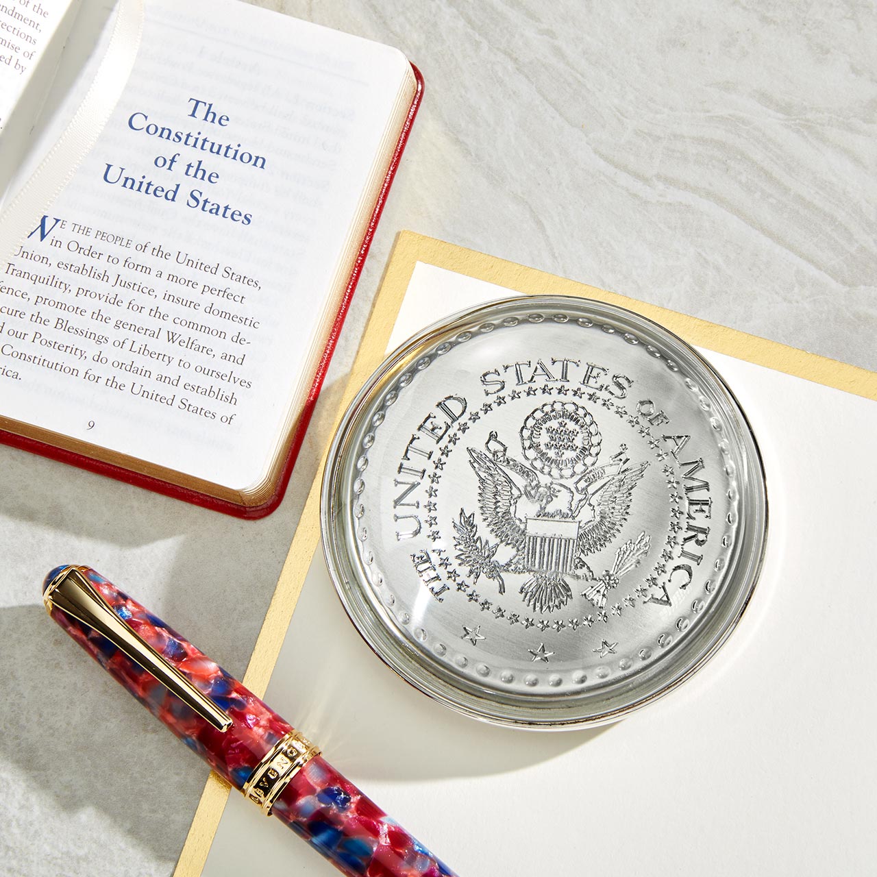 Here’s a shining piece of Americana to grace your desk and keep paperwork in check. Engraved with the Great Seal of the United States protected under a glass dome, our Monticello pewter paperweight is named for the Virginia home of Thomas Jefferson, the nation's third President. (The actual Great Seal is kept by the presiding Secretary of State; Jefferson served as the very first Secretary of State from 1790 to 1793 under President George Washington.) Handcrafted in the USA.