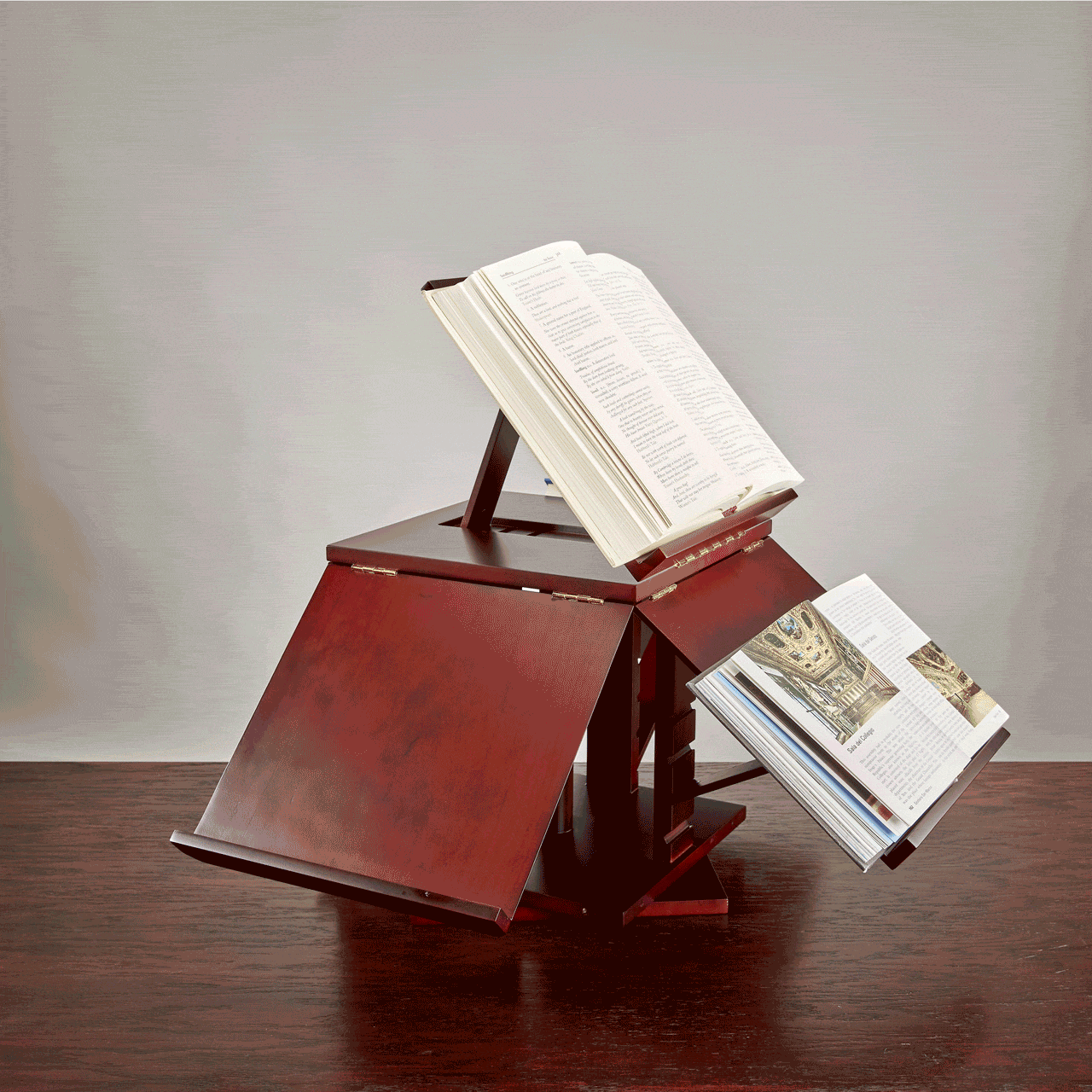 This Product Ships Free. A new world of reading unfolds. The Library-Go-Round adds a distinctive difference to your library, a unique way to show off your favorite tomes and a useful method of conducting research and taking notes. The five shelves of this revolving book display, inspired by one owned by Thomas Jefferson, can hold several books at various levels and angles and are also useful for note-taking and cross-checking information from several sources. The spinning lazy susan-style base of this rotating bookcase is perfect for spotlighting rare first editions, specialty books, favorite artwork and photographs. The Library-Go-Round folds up neatly into a 12" box when not in use.