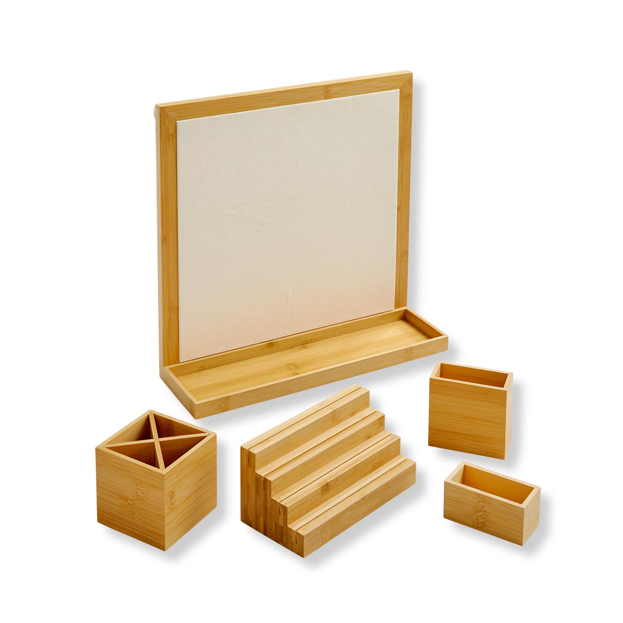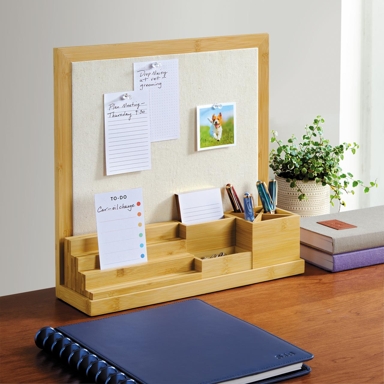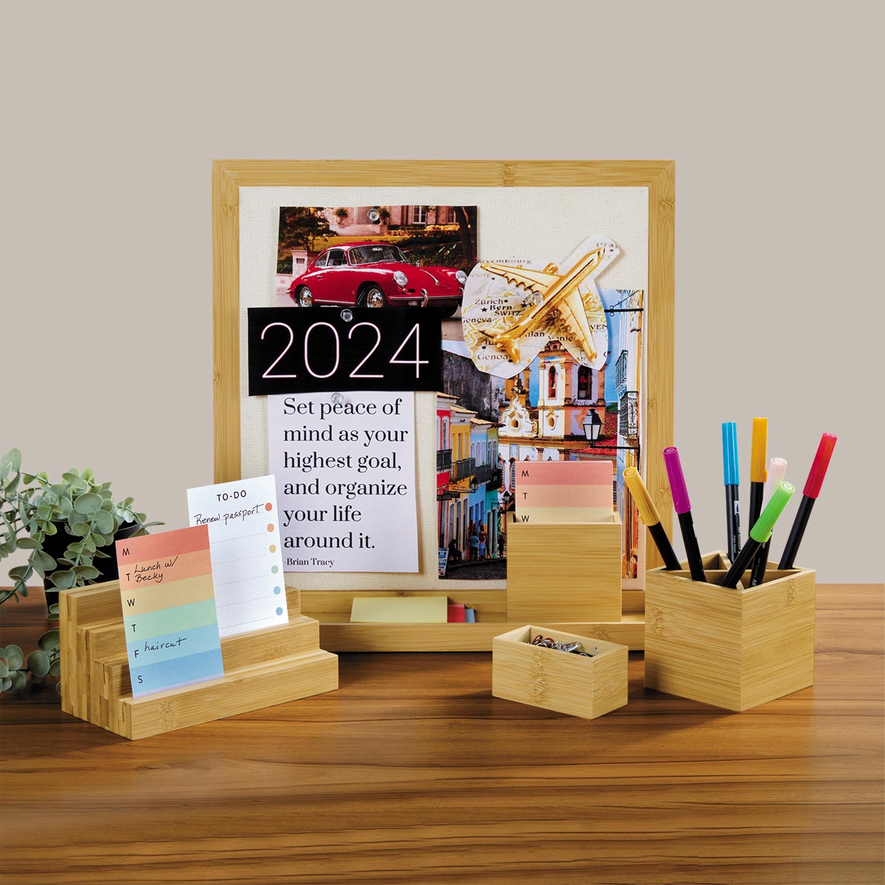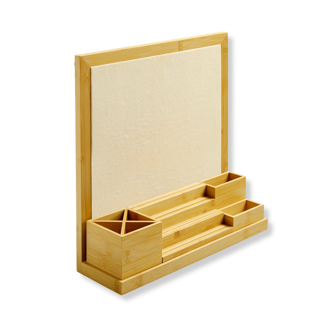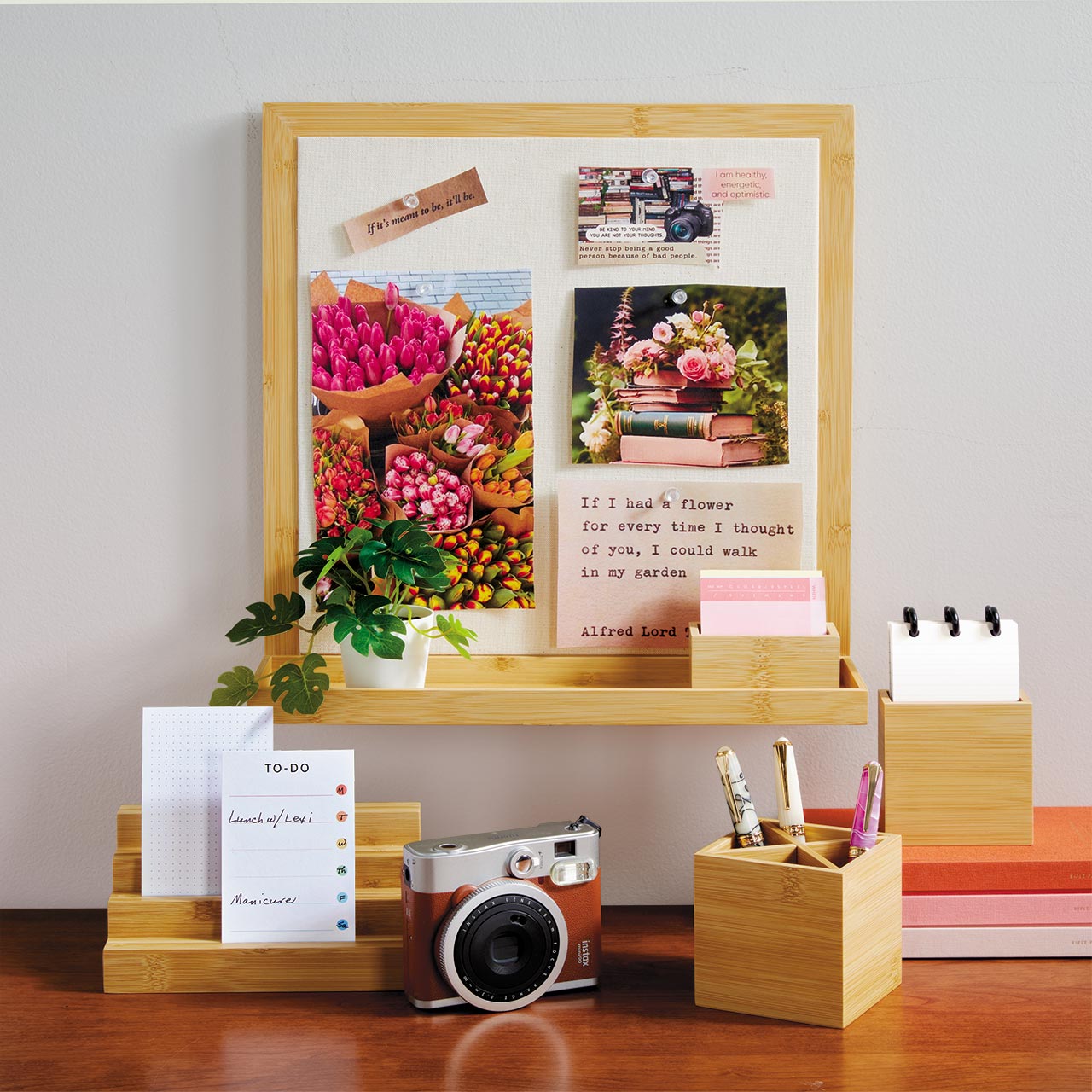 Now visionaries can dream even bigger. A vision board is any blank canvas you fill with images, words and symbols that inspire and motivate, encouraging you to reach your goal. A useful tool for entertaining dreams, desires, hopes and plans of all kinds, it’s helpful for realizing goals both personal and professional. It can also be used for brainstorming, strategizing and hammering out the nitty-gritty details of a multi-pronged project. Our modular Vision Quest Board & Dream Hub desk organizer can fulfill all these uses and more. This 14 x 15 bulletin board, crafted in sturdy solid bamboo, includes an attached tray with removable 4-row, bleacher-style card stand so you can integrate 3 x 5 cards for strategic project planning, as well as two removable compartments for note cards and clips, push pins and writing tools. Personalize it with an optional monogram, full name or quote of up to 44 characters.