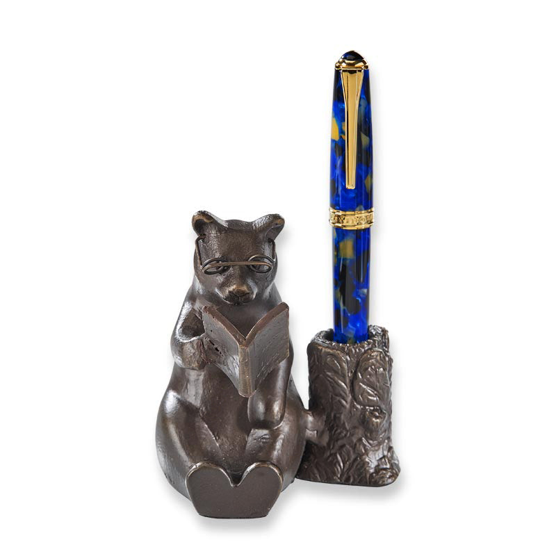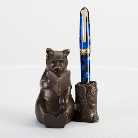 Our beloved reading bear pen holder is a perennial favorite. He knows no one will steal your pen in his natural habitat, the middle of the forest, next to his favorite hollow stump…so he can enjoy his reading in peace, with nary a need to growl. Made using the time-honored lost-wax process for optimal detail: The artist first creates a model in clay which is covered with silicone rubber to create a negative 3-D image. The hollow silicone is filled with liquid wax, then carefully bathed in ceramic. Molten metal is poured inside, dissolving the wax. After the metal cools, the mold is broken away to reveal the beauty beneath.