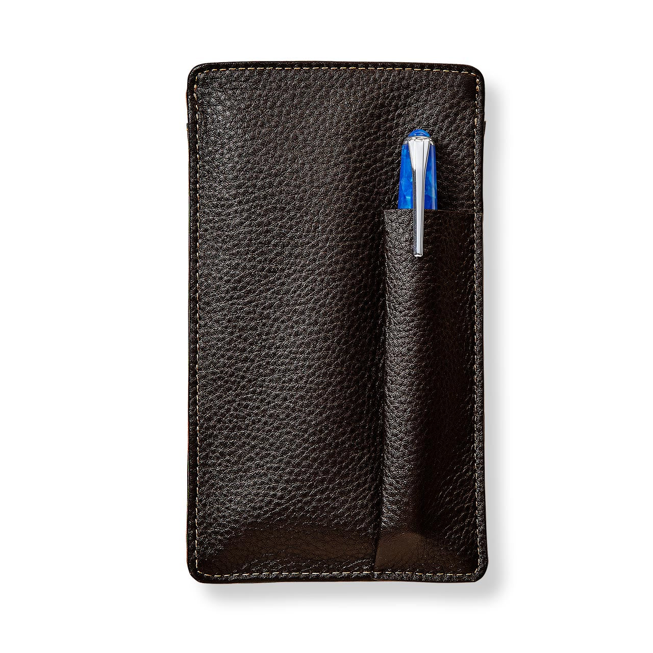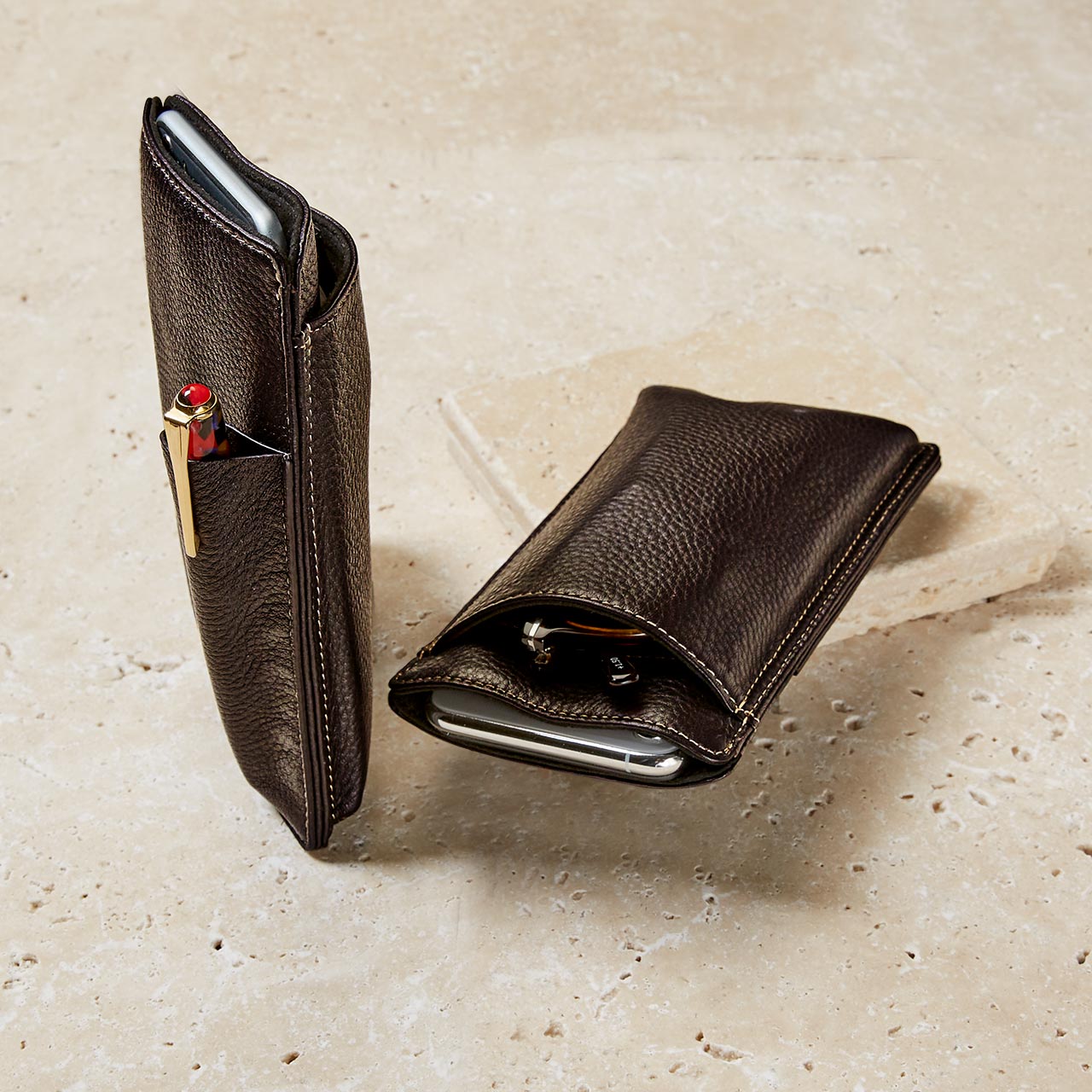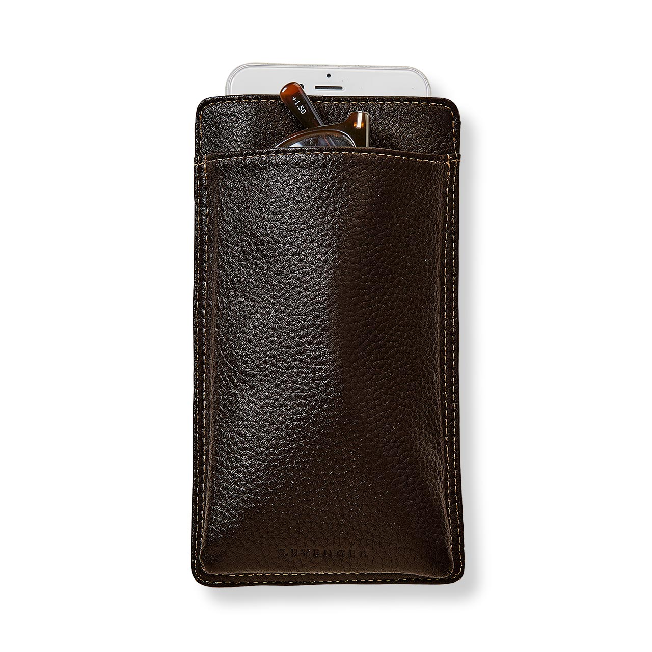 Glasses, phone, and a pen–that's the triad that makes up the everyday carry for some Levenger customers, and hence our designers developed this clever case. A phone slips into the center sleeve, lined with protective microsuede. Slip your specs on one side, your favorite traveling pen on the other. Your trio is ready to tour. Also available in .
