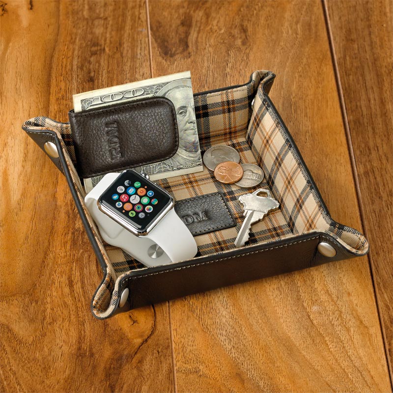 A foldable leather desk tray for travelers. Here’s a valet tray that folds and snaps to keep you organized wherever you go. The Bomber Jacket Snap Tray holds small accessories for your desk or wherever you choose. It lays flat for easy storage or travel when you unfasten the snaps. Add a monogram for a personal touch.