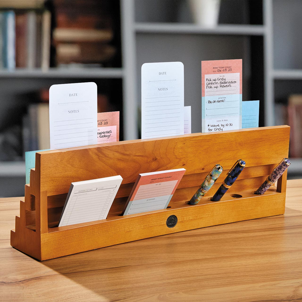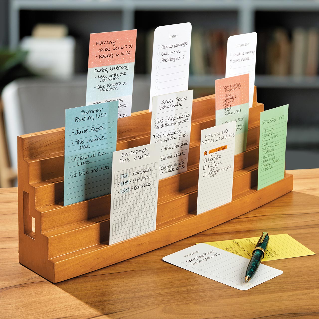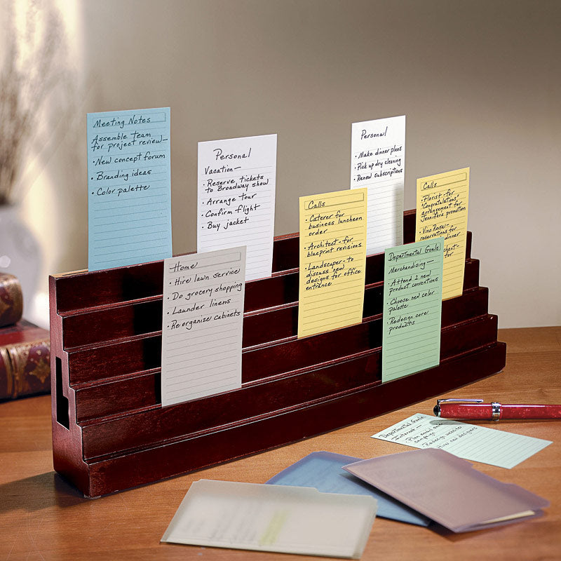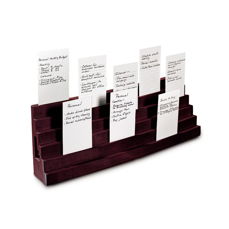 Storyboard your ideas with our popular index card holder. Develop plans or concepts in a dynamic, visual fashion with six rows for cards. You can rearrange them by topic, priority deadline or other order. Place four pens and extra cards in the hidden slots in back. We include 150 of our high-quality 3 x 5 cards.