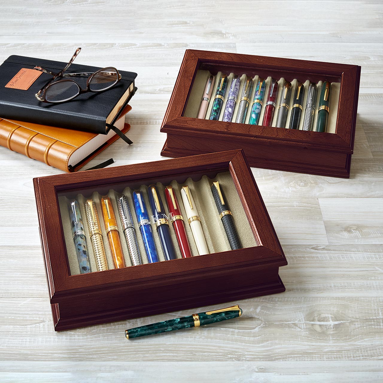 A handsome pen box that lets you view your pens from a fresh angle. The Point of View Pen Case holds 10 pens at an angle, almost offering them to you when you open the glass top. This pen display box protects your collection from dust, and the grooved cradles are lined in nonreactive suede to keep your pens pristine. A Levenger 35th Anniversary product, introduced in 2002.